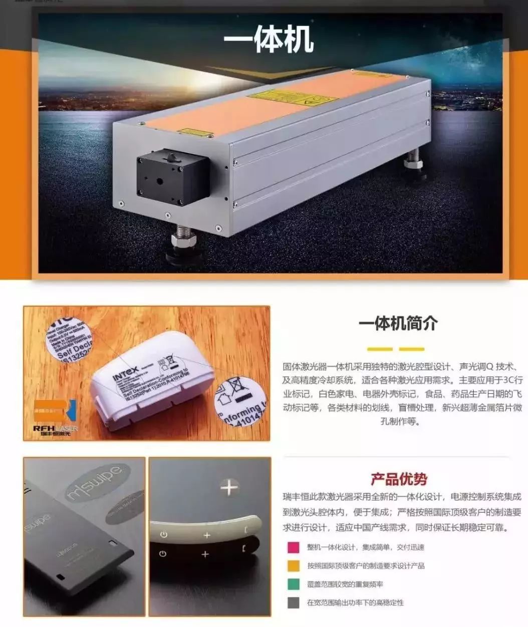 瑞丰恒此次带来激光器系列新产品,一开展就惊艳四方,赚足游客的眼球,早早锁定了“展会的C位”。瑞丰恒固体激光器一体机在本届展会上精彩演绎全新的激光技术应用,其采用独特的激光腔型设计、声光调Q技术及高精度冷却系统,适合各种激光应用需求,主要应用于3C行业标记,白色家电/电器外壳标记,食品、药品包装生产日期的飞动标记,各类材料的划线,盲槽处理,新兴超薄金属箔片微孔制作等。